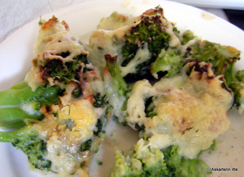 Tekasin tuossa parsakaalikratiinia. Laitoin pippurilla maustettua ruokakermaa ja pinnalle emmental juustoraastetta. Paistoin uunissa, ja tuli hyvää:)