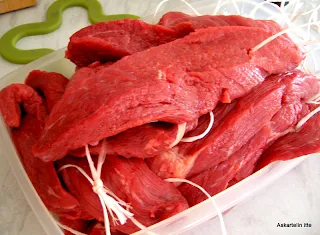 Tämä naudan ulkopaisti tässä oottelee suolaveteen menoa. Laitan 9% suolaveteen vuorokaueksi ja sitten ulos kuivumaan:) Narut laitoin tässä vaiheessa jo, on helpompi, muutakun nostella vain kuivuun.