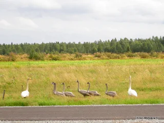 Lauantaina kauppareissulla meni joutsenet tien yli pellolle. Siinä seurailin niitä pitkään kun taapersivat. Ensimmäinen kuva on ikkunanläpi. Pikku pokkarilla kuvasin auton ikkunasta ja liian kaukaakin.