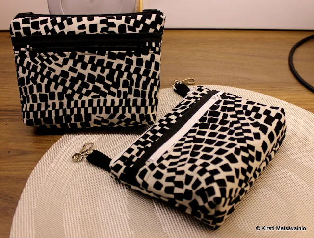Tämmönen laukku syntyi nyt. Tässä on avotasku ja vetoketjutasku edessä.